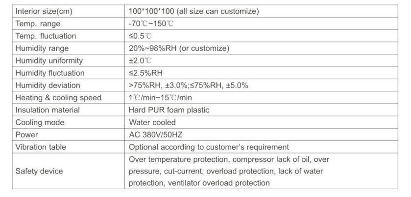 This machine complied with national standard, able to satisfy special testing requirements ,is widely applied for electronic and electric products, automotive parts ,components and materials by high low constant temperature ,temperature change, shock, damp heat vibration etc combined environment simulation reliability test.