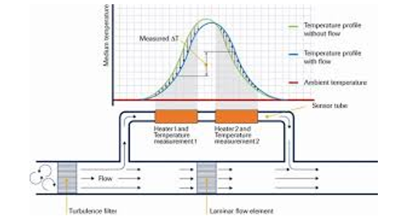 A thermal flowmeter contains two PT100 temperature sensors for this purpose. One sensor measures the current fluid temperature as a reference. The second sensor is heated and has a constant temperature differential relative to the first sensor at “zero flow.”